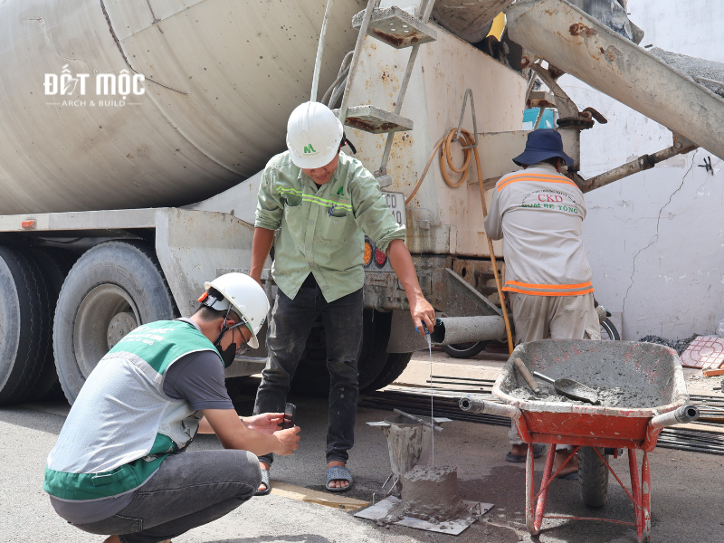Trước khi đổ bê tông, gia chủ cần kiểm tra độ sụt. Độ sụt thường dao động từ 10-14cm, nếu bê tông không đạt yêu cầu về độ sụt, gia chủ có quyền từ chối nhận mẻ bê tông và yêu cầu xe quay lại trạm trộn để điều chỉnh.